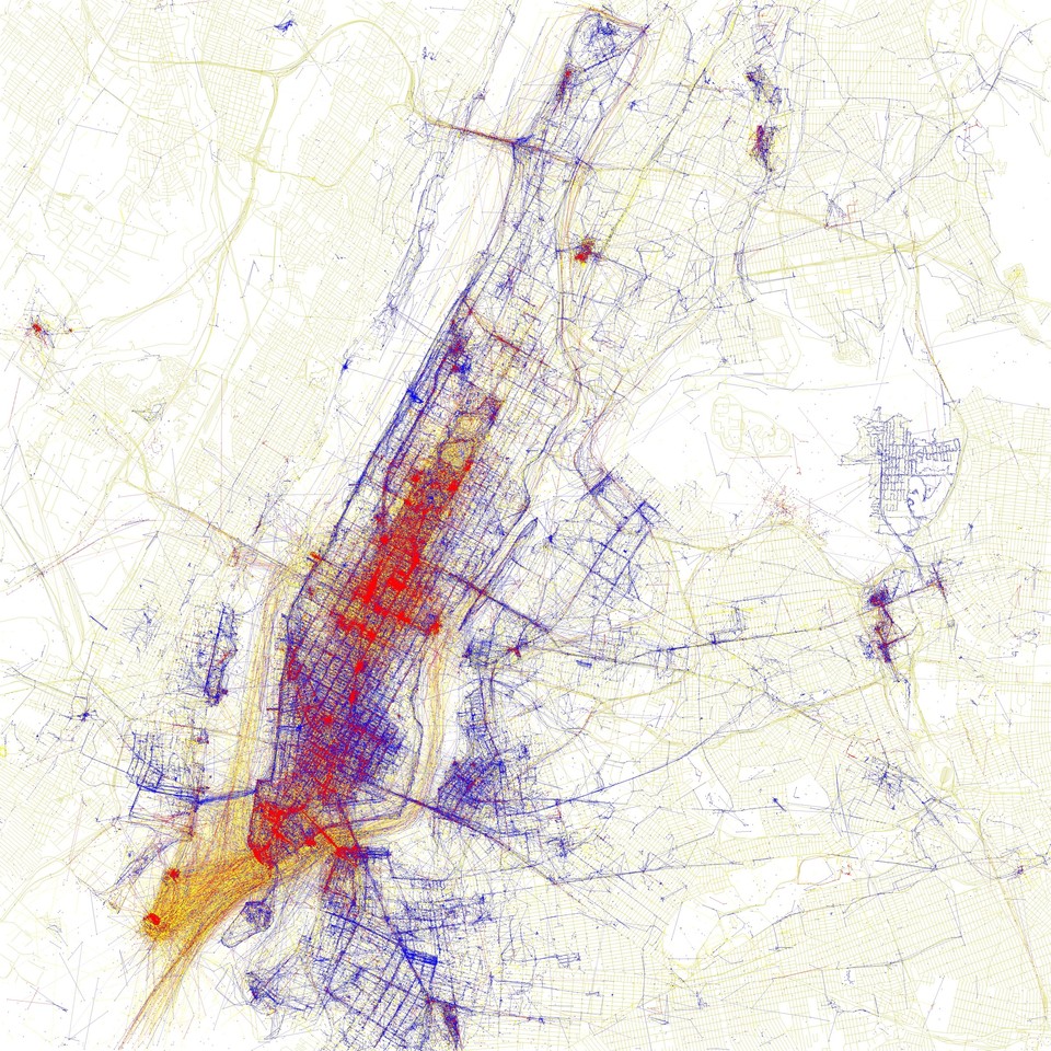 'Big Data' bla bla bla 'Georreferenciação' bla bla bla 'Crowdsourcing' bla bla bla. Despachadas as buzzwords e feito o alerta de que a NSA e afins usam as mesmas tecnologias para nos mapear, abaixo três mapas diferentes da cidade de Nova Iorque.