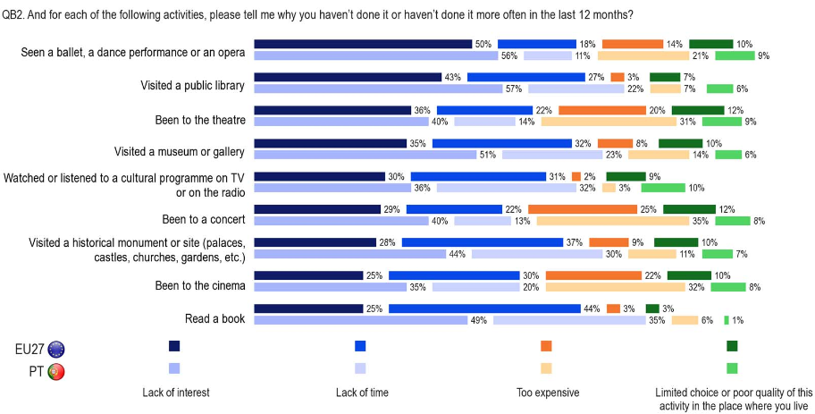 No segundo gráfico, estes indíces são dissecados por áreas de interesse. Respondendo à pergunta "Quantas vezes nos últimos doze meses...", Portugal tem as percentagens mais baixas em leitura, ida a concertos, ao teatro, dança ou ópera, a segunda mais baixa em cinema e visita a monumentos, museus ou galerias e a terceira mais baixa em visitas a bibliotecas.