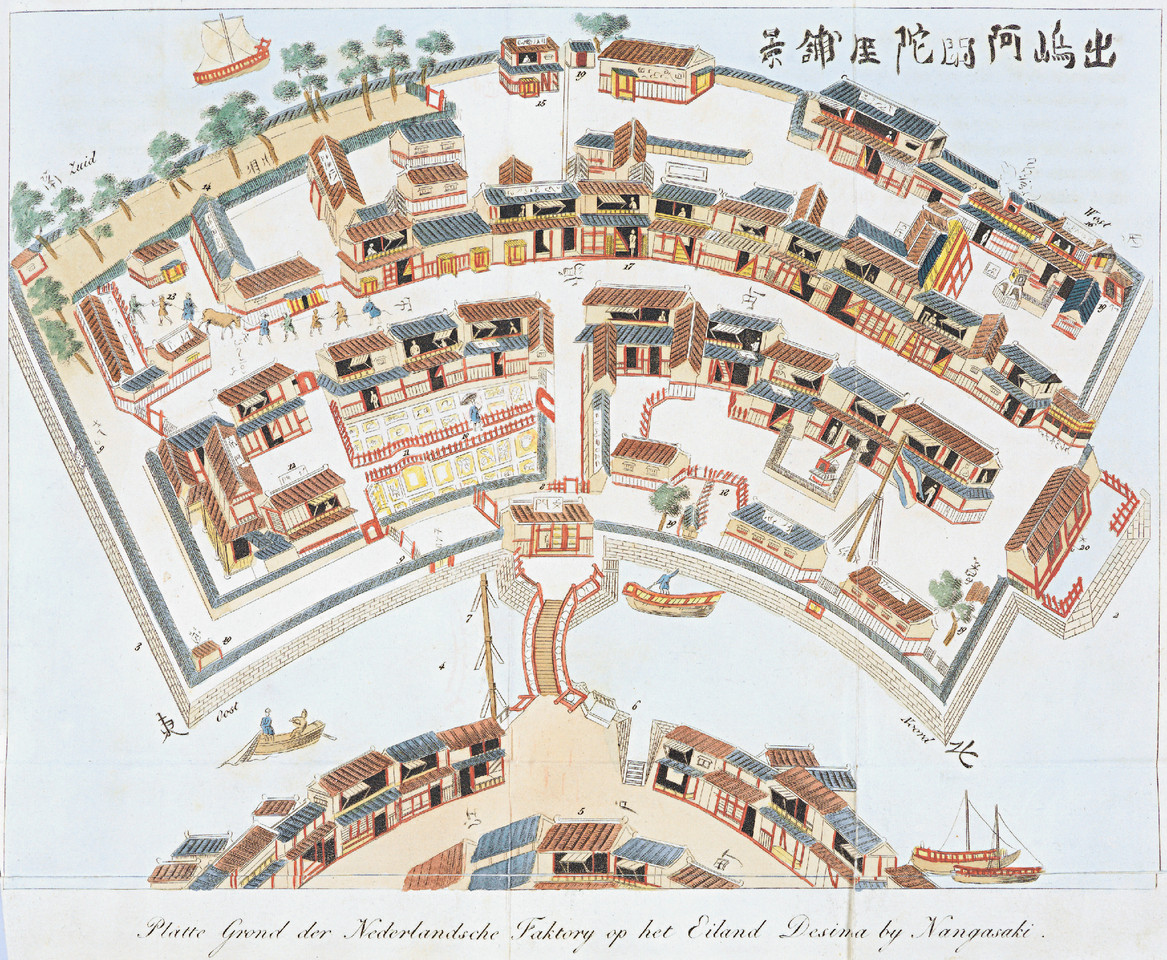 Dejima (Japanese: 出島?, "protruding island"), in old Western documents latinized as 'Decima', 'Desjima', 'Dezima', 'Disma', or 'Disima', was a small fan-shaped artificial island built in the bay of Nagasaki in 1634 by local merchants. This island, which was formed by digging a canal through a small peninsula, remained as the single place of direct trade and exchange between Japan and the outside world during the Edo period. Dejima was built to constrain foreign traders as part of sakoku, the self-imposed isolationist policy. Originally built to house Portuguese traders, it was used by the Dutch as a trading post from 1641 until 1853. Covering an area of 120 m x 75 m (9000 square meters, or 0.9 hectares), it later was integrated into the city.